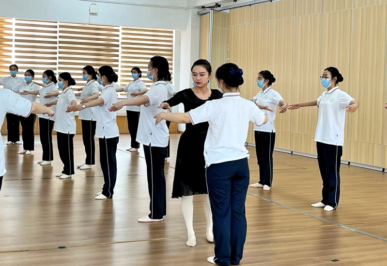 来自艺术教育中心的张政老师和廖凯旋老师分别从“精讲把杆小踢腿组合(一)”和“芭蕾基本舞姿训练——手臂练习”两个内容向学生展示舞蹈的魅力,帮助学生提升护理职业形象和气质。