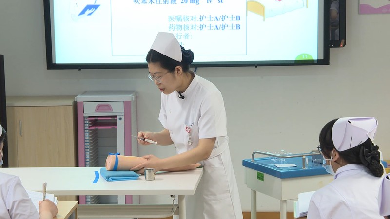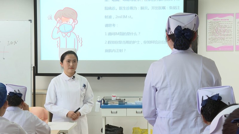 护理系薛琦老师选取“肌内注射法示教”作为公开课的讲解内容,运用多媒体课件及创设情境的手段,使学生掌握了肌内注射的护理技能。姜肖宇老师以“特定人群的营养与膳食——青少年”为主题,在贴合学生年龄和实际生活的情况下,最大程度激发学生的学习兴趣。潘美伯老师进行“静脉注射法示教”的公开教学,通过示范引导及小组合作学习,以理实一体的教学方式锻炼学生动手操作的能力。魏佳慧老师讲授“重症监护记录单的书写”,将案例贯穿在整堂课之中,鼓励学生独立完成一份重症患者监护记录单,由组长进行汇报,小组之间互评,推动学生从“怕学、不学”转变为“主动学习”。