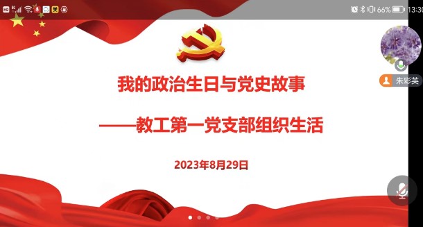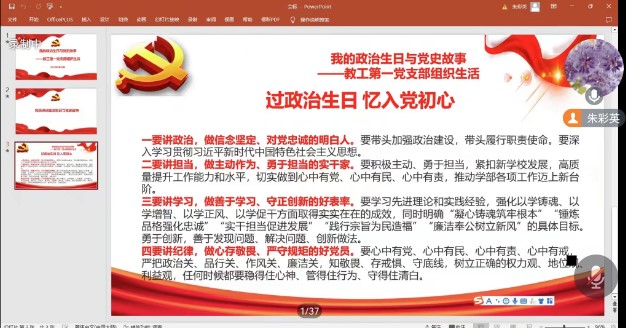 8月29日下午,教工第一党支部利用腾讯会议平台线上开展了主题为“我的政治生日与党史故事”的组织生活,党支部26名党员参加会议,副校长张建中以普通党员的身份参会。会议由支部书记朱彩英主持。