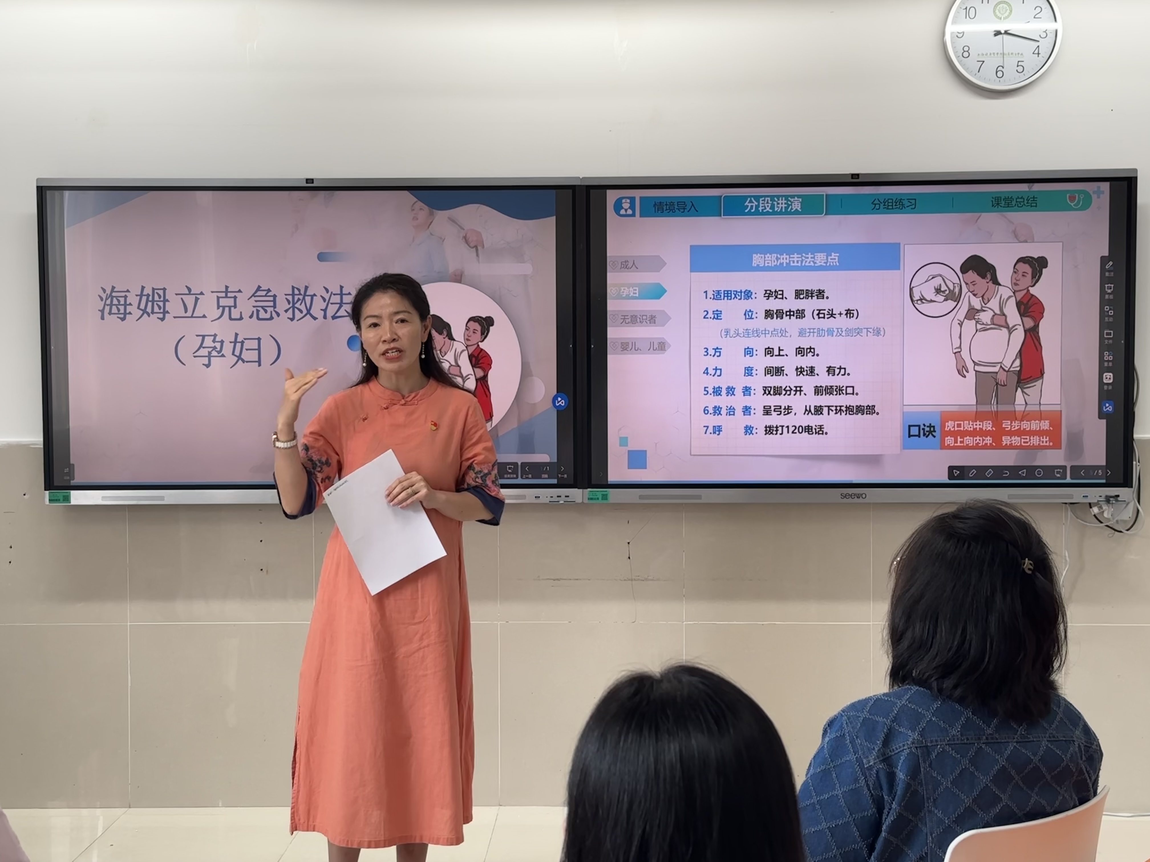第四届全国职业院校教师教学实践技能(护理专业)比赛获奖教师陈炜和姜肖宇分别进行“急救护理”和“老年护理”两门课程的说课示范。邹丽萍、冯宗媚、张伊倩老师代表团队先后展示了上海市中等职业学校教师教学能力比赛获奖作品中的“海姆立克急救法(孕妇)”教学片段和“胎心监护”教学片段。五位示范教师的展示精神面貌饱满、教学理念先进、教学语言精炼、教学思路清晰。她们的分享不仅为新教师提供了丰富实用的教学策略,也激发了大家对于教学的深入思考。