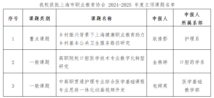 近日,上海市职业教育协会公布了上海市职业教育协会2024-2025年度立项课题名单,全市中高职院校共70项课题获批立项。我校3项课题获批立项,其中重点课题1项,一般课题2项,立项数量位居中高职院校前列。