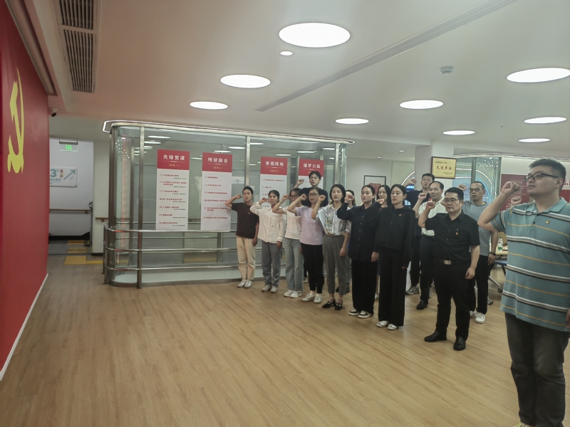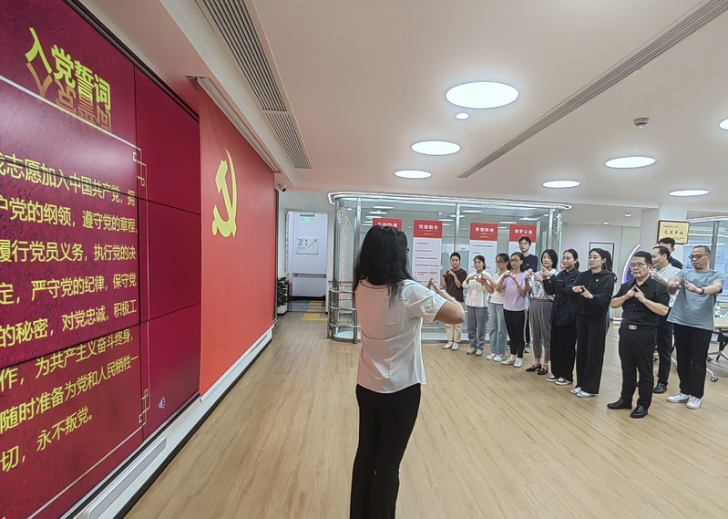 第二议程重温入党誓词。全体党员肃立,奏唱国歌。中心的言语残疾党员带领大家用手语学唱国歌,用特殊的方式表达对祖国的深情厚谊。随后,面向党旗,由钱书记领誓,党员们再次许下了对党的忠诚誓词。铿锵有力的誓言坚定的是党员们的理想信念、对初心的坚守,更是对未来的承诺。在奏唱国际歌的激昂旋律中结束本环节。
