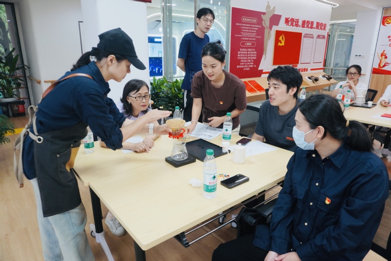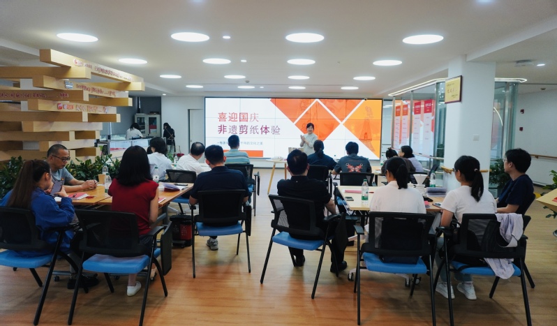第四议程是“党建助残+公益”实践活动,无声咖啡制作和非遗剪纸体验。区冠军手冲咖啡师、听力障碍的马晟用指尖传递声音,带领大家制作无声咖啡,共同构筑有爱无碍的氛围。大家不仅学会了制作手冲咖啡的技巧,更深刻感受到了残疾人自强不息、积极向上的精神风貌。非遗剪纸大人钟明霞带领大家剪出庆祝国庆75周年的图样,并指导大家用红色纸样、非遗锦灰堆在相框底板上装点出对祖国美好祝愿。