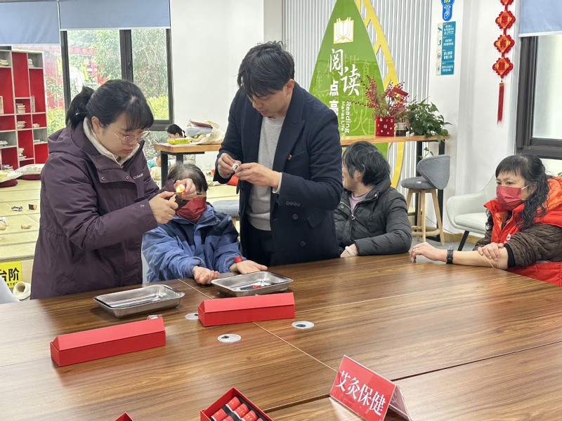 活动中,五位党员老师充分发挥自身的专业优势,为社区居民提供了耳穴埋籽和艾灸保健等中医特色服务项目。居民们对此次志愿服务活动热情高涨,体验区前排起了长队。沈蓓蓓和潘美伯负责耳穴埋籽项目,她们耐心地向居民讲解耳穴埋籽的原理和效果,并根据每个人的健康需求,精准地选取耳部穴位进行埋籽,帮助他们调理头痛、失眠等症状。