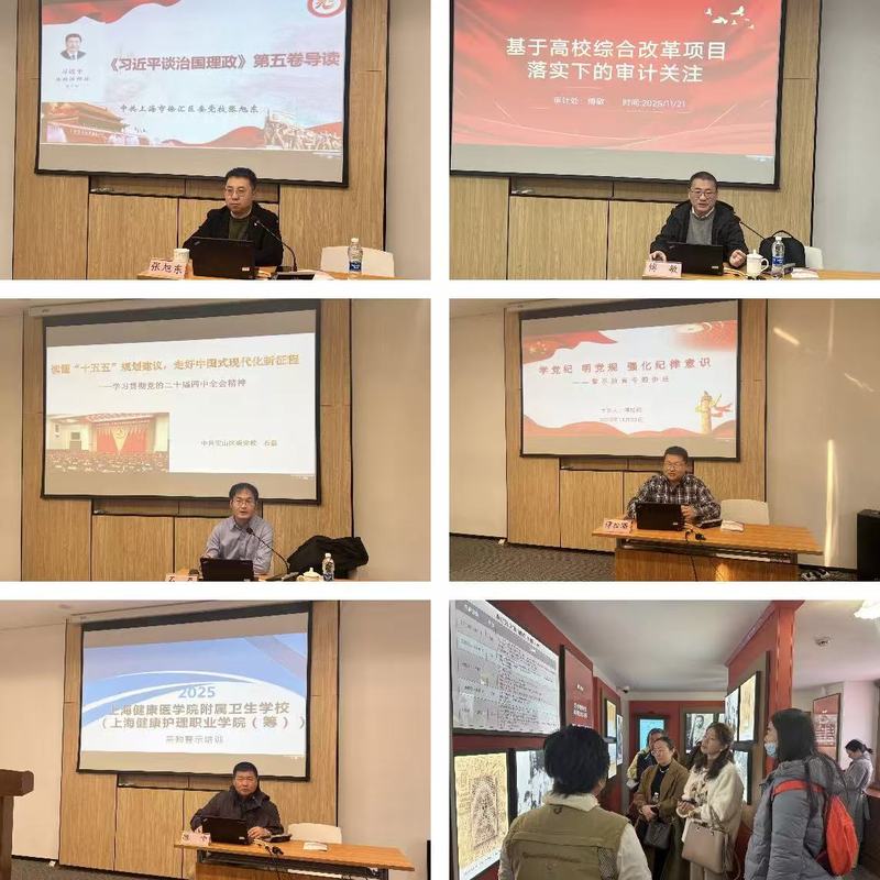 本次培训课程紧扣转型需求,兼具政治高度、专业深度与实践温度。特邀上海健康医学院资产与设备管理处、审计处、纪委办业务骨干开展采购规范、合规审计、警示教育等工作实务培训;邀请徐汇区委党校、宝山区委党校专家,围绕《习近平谈治国理政》第五卷、党的二十届四中全会精神等开展专题讲座。课程坚持“实际、实用、实效”原则,推动理论学习与工作需求精准对接。