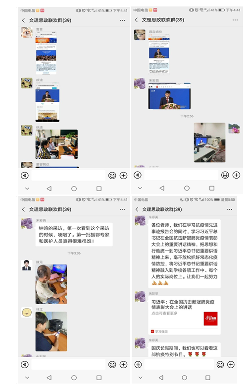 报告会结束后,教工第一党支部书记朱彩英老师要求老师们在学习抗疫情先进事迹报告会的同时,学习习近平总书记在全国抗击新冠肺炎疫情表彰大会上的重要讲话精神,把思想和行动统一到习近平总书记重要讲话精神上来,毫不放松抓好常态化疫情防控,将习近平总书记重要讲话精神融入到学校各项工作中、每个人的实际岗位上,发挥党员先锋模范作用,为学校发展当好高素养、有温度、怀大爱的文理思政人!(教工第一党支部)