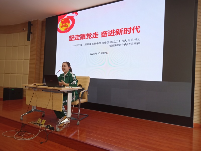 为深入贯彻全国学联二十七大精神、学习习近平总书记的贺信精神和党中央致辞精神,持续推进我校共青团改革和学生会组织改革工作,全面加强我校学生会组织政治建设,努力团结凝结广大团员青年,引领青年听党话、跟党走,10月22日中午,在报告厅1楼召开了全校学生骨干专题学习会。校团委委员、全体学生会成员共计150余人参加本次大会,会议由团委副书记钱子怡主持。