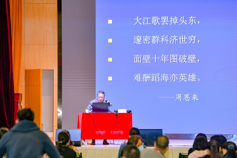 张家禾教授从周恩来总理的早期个人经历、革命生涯、人民的总理和精神风范这四个方面,给在场师生们生动的介绍了周恩来总理光辉伟大的一生。周恩来同志半个多世纪奋斗的人生历程是中国共产党不忘初心、牢记使命历史的一个生动缩影,是新中国孕育、诞生、成长和取得崇高国际威望历史的一个生动缩影,是中国人民在自己选择的革命和建设道路上艰辛探索、不断开拓、凯歌行进历史的一个生动缩影。