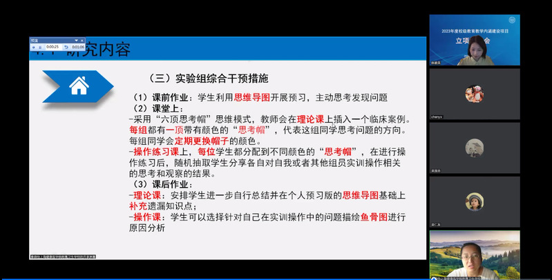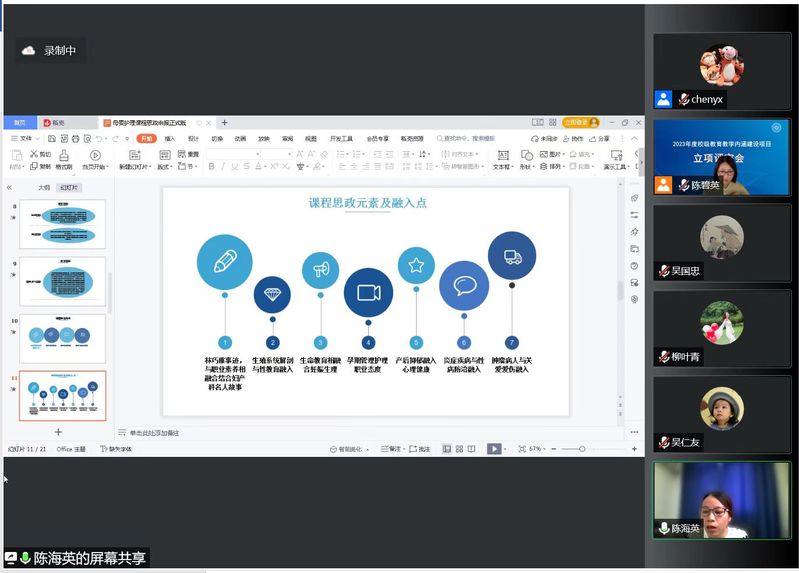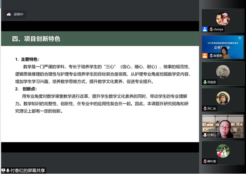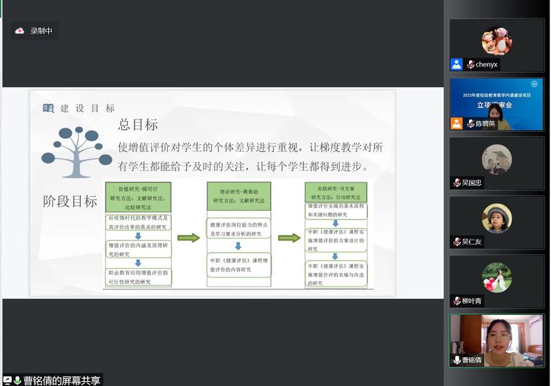 本次申报课题主要围绕当下职业教育高质量发展热点,着力研究新课标背景下中职公共基础课程教学改革、护理专业课程教学改革、课程思政建设等方面内容,共有18项课题申报立项评审,其中课改课题类项目13项,“课程思政”示范课程培育类项目5项。各项目申报负责人依次入场,采用PPT形式汇报课题建设的主要内容。与会专家认真听取汇报,仔细审阅申报书,与申报负责人展开热烈探讨,深入了解立项背景和概况,找出课题设计中的不足之处,在课题意义、研究思路、研究内容、研究设计与方法等方面给予了精准、专业的修改意见和建议,并根据申报材料及汇报答辩情况进行综合评分。