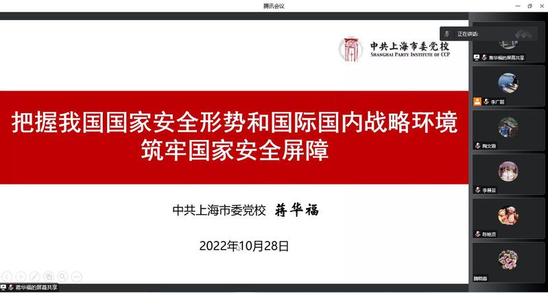 为深入学习贯彻党的二十大精神,帮助全体教职工系统学习、理解习近平总书记关于总体国家安全观的重要论述,10月28日下午,学校特邀中共上海市委党校蒋华福教授作《把握当前我国国家安全和国际国内战略环境 筑牢国家安全屏障》专题讲座。会议由校党总支副书记臧圆圆主持,校领导、全体教职工参加学习。