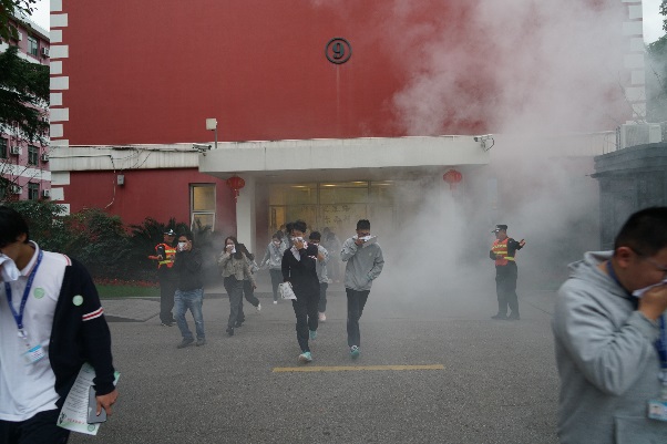 安全讲座结束后,学校副校长张建中宣布消防演练开始。全体师生参与了消防疏散逃生演练、灭火器使用演练、消防帐篷逃生演练,通过模拟真实火灾中逃生、灭火等场景,体验了火场逃生、消防灭火等防火安全知识与技能。