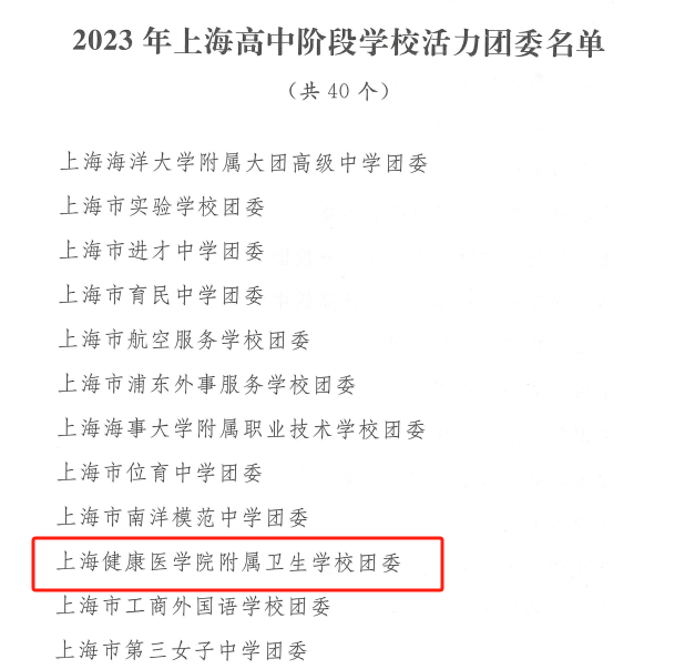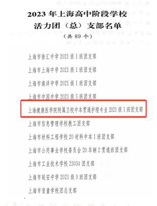 近日,共青团上海市委员会、上海教育委员会发布《关于表扬2023年上海高校、高中阶段学校活力团组织、活力社团、团干部示范典型的决定》,我校团委获“2023年上海高中阶段活力团委”称号;21护理中本1班团支部获“2023年上海高中阶段活力团支部”称号。