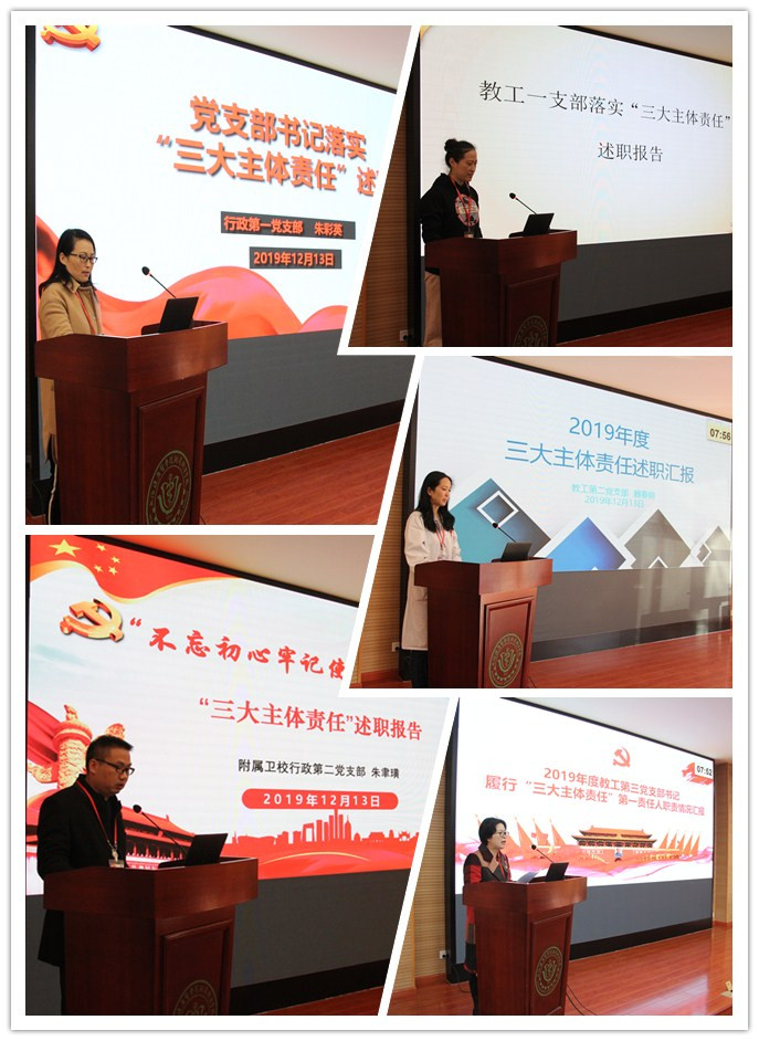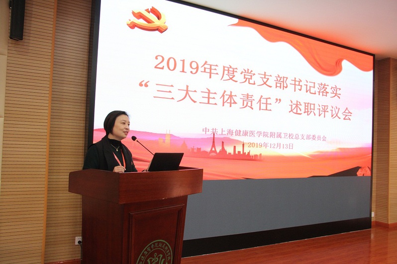 12月13日上午,附属卫校党总支在三号楼一楼报告厅召开了2019年度党支部书记落实“三大主体责任”述职评议会,学校党总支书记、常务副校长钱艳、党总支副书记朱文娟、副校长徐敏、党总支委员、各党支部书记、委员、行政职能部门负责人出席了会议,会议由综合办公室主任臧圆圆主持。