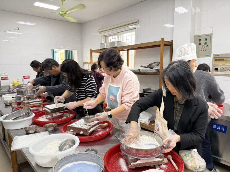 午餐后的重头戏是“体验金山非遗——白龙糕制作”。在农庄师傅的悉心指导下,大家纷纷化身“糕点师”,从揉粉到入模、点缀,每一个步骤都做得有模有样。现场笑语不断,虽然手法略显生疏,成品却十分精美,但亲手参与传统美食制作的过程充满了乐趣与成就感。当热气腾腾、米香四溢的白龙糕出炉时,大家品尝着自己的劳动成果,甜在嘴里,暖在心里,对金山本地的传统文化也有了更深的认同与情感。