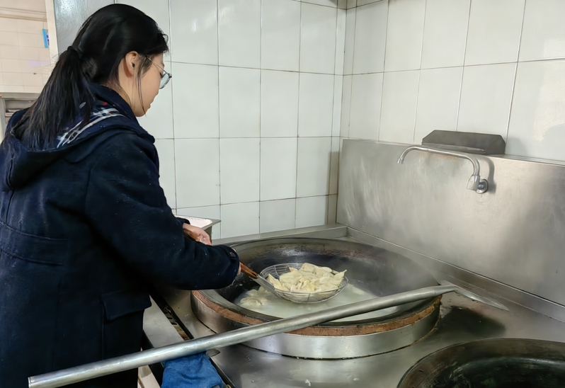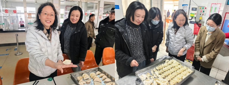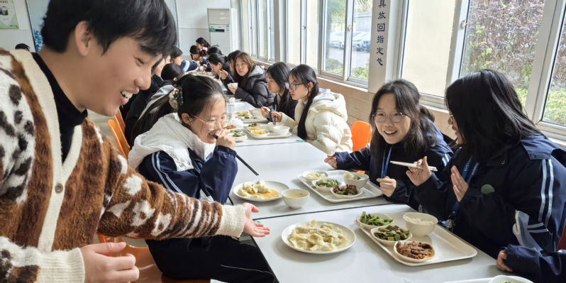 随后,陈荣凤校长也加入到包饺子的队伍中,她手法格外娴熟,取皮、填馅、捏褶的动作一气呵成,利落又好看,引得身边的师生连连称赞。紧接着,钱艳书记来到后厨,驻足观看同学们煮饺子的过程,还不时夸赞大家的手艺精巧。热气腾腾的饺子出锅后,校领导们与师生围坐共品劳动成果,热气氤氲间,进一步拉近了校领导与师生的距离,凝聚起家校同心的深厚情谊。