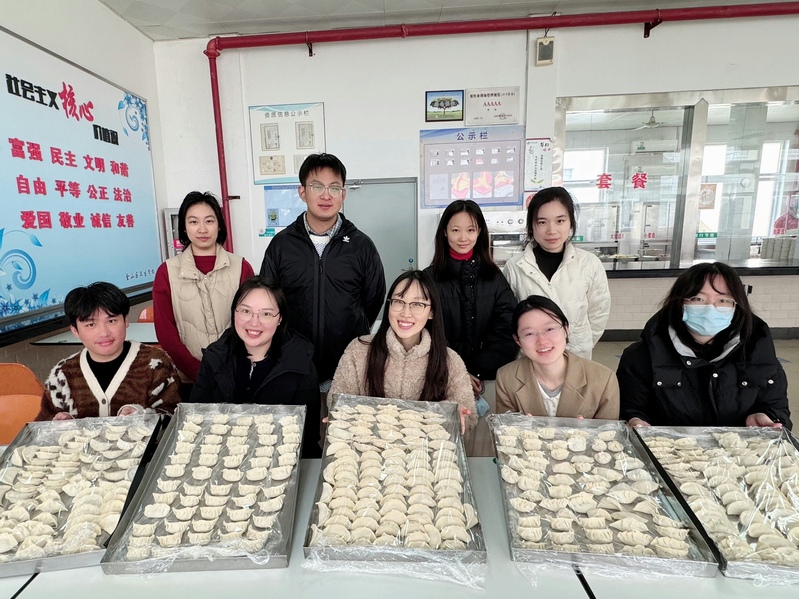 活动现场温馨融融,提前备好的面皮、馅料整齐摆放。教工团员们暂别教案讲台,挽袖围坐,在食堂师傅的指导下,元宝饺、月牙饺等各式饺子错落成形;他们一边示范包法,一边讲述各地冬至习俗。同学们认真模仿、创意频出,师生协作间,一盘盘形态各异的饺子很快就绪。