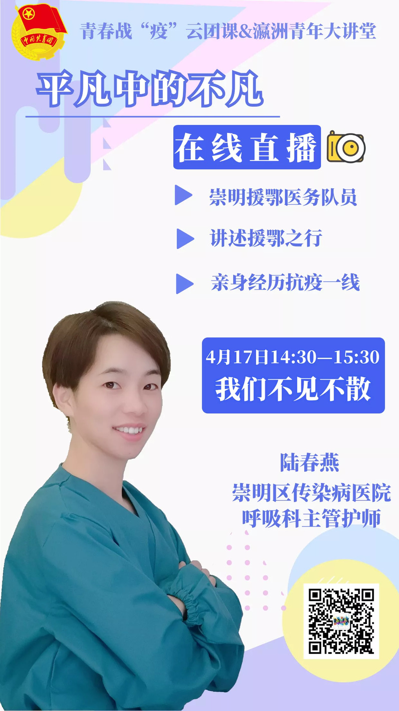 (二)组织学生观看抗疫英雄直播团课。我校积极组织动员学生参加了由崇明区团区委举办的“平凡中的不凡”青春战“疫”云团课,一起在线聆听第二批上海援鄂医疗队成员、崇明区传染病医院呼吸科主管护师陆春燕的援鄂经历、心得感悟,更加直观地感受面对疫情时,我们广大青年医务人员们的大爱大勇,并以此为契机,教导学生学习体会疫情中那些闪耀的故事、了不起的英雄和永不磨灭的中国精神,领悟人生,成就更加优秀的自己。