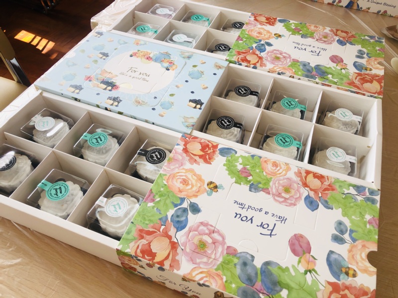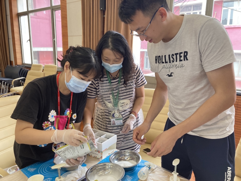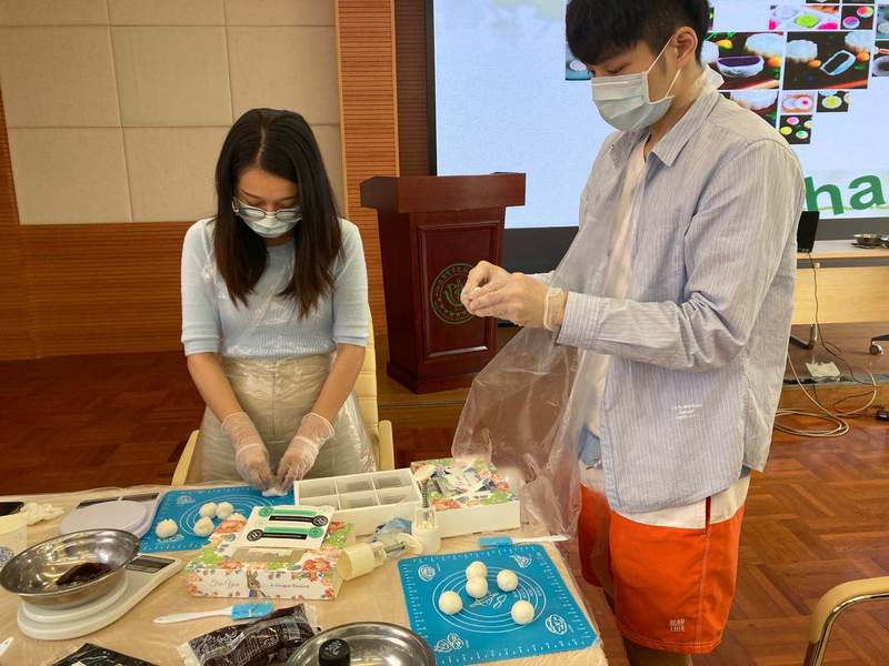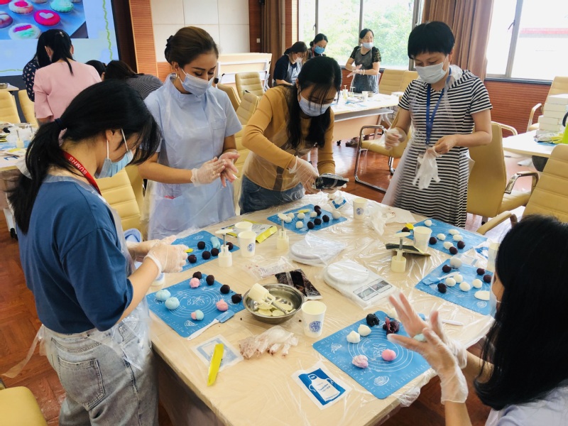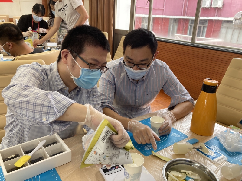 本次活动的馅料我们选用了大众喜爱的黑芝麻、豆沙和紫薯,配以天然果蔬调色剂,简单三步:沸水冲入,揉搓成团;均匀分割,冰皮包馅;放入模具,按压出模,轻轻松松做出晶莹剔透的冰皮月饼。活动中老师们发挥各自的厨艺特长,在揉搓面粉、冰皮包馅、色彩搭配中都显露出了双面娇娃工作之外的另一面。