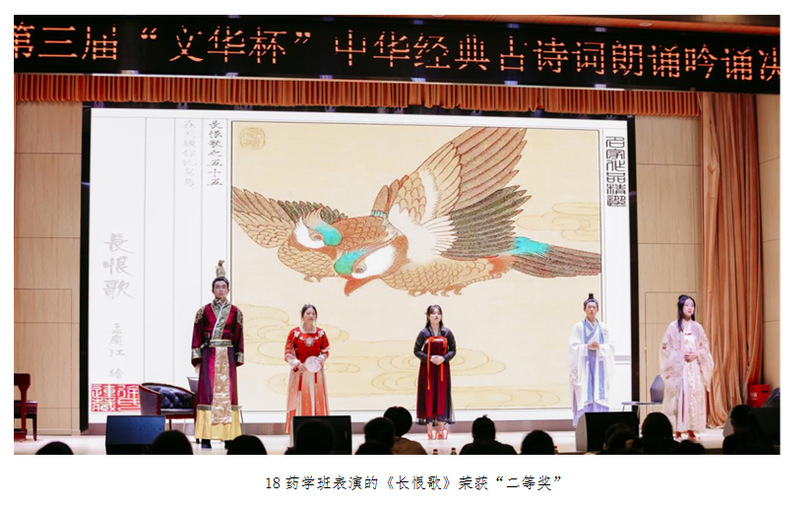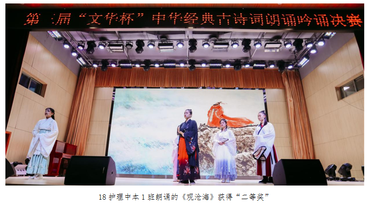 其他19个参赛作品分别斩获二等奖、三等奖、优胜奖。其中,18护理中本1班的《观沧海》、18护理中高3班的《国殇》、18药学的《长恨歌》、19护理中高4班的《西岳云台歌送丹丘子》、18药学的《卖炭翁》、18药学的《琵琶行》等六个作品在诗歌的情景化设计、编创方面特别优异,形象、生动地将诗歌的意境采用具象的影像、形体动作加以展现,让观众有身临其境之感。