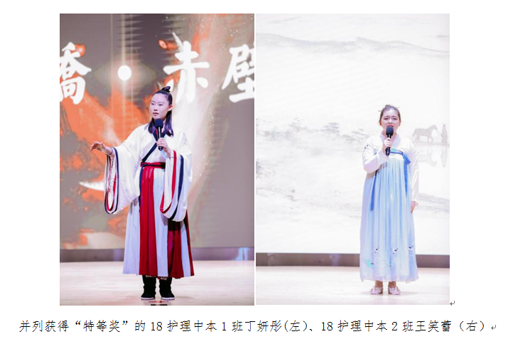 18护理中本1班丁妍彤独诵的《念奴娇•赤壁怀古》,以空灵通透、铁丝钢缕的声音,喊出了苏轼面对人生困境的洒脱旷达与老骥伏枥的斗志豪情,也以90.2的平均分一举摘得大赛特等奖。