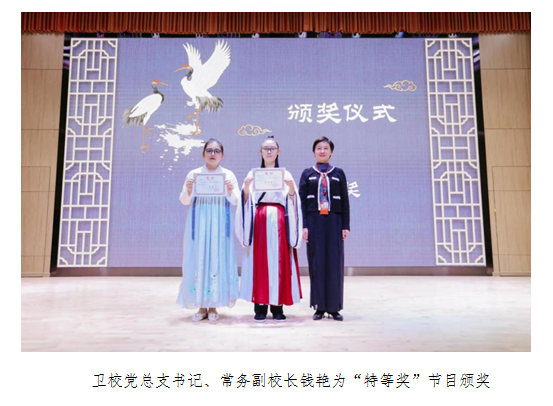 党总支书记、常务副校长钱艳为两名“特等奖”获奖同学颁发获奖证书。校长汤磊为“一等奖”获奖同学颁发获奖证书。特聘评委郑洁、顾斐雯老师为“二等奖”获奖组颁奖。学生科科长朱聿璜、质控中心主任陈碧英、教务科科长苏李欢、校团委书记学生科副科长蔡辰年、为获得“三等奖”的同学颁发获奖证书。体育艺术部主任倪益、职业技能培训中心主任陆静为获得“优胜奖”的同学颁奖。