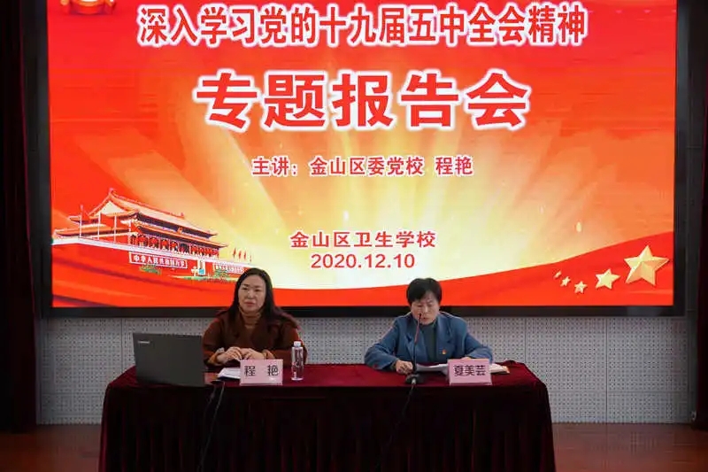 12月10日下午,我校举行深入学习领会党的十九届五中全会精神专题报告会。特邀金山区党的十九届五中全会精神宣讲团成员、金山区委党校教科研室主任、工会主席、程艳副教授作《开启全面建设社会主义现代化国家新征程》——学习党的十九届五中全会精神专题报告。报告会由校党支部书记夏美芸主持,全校全体师生参加了会议。