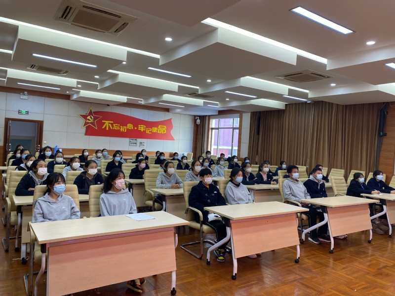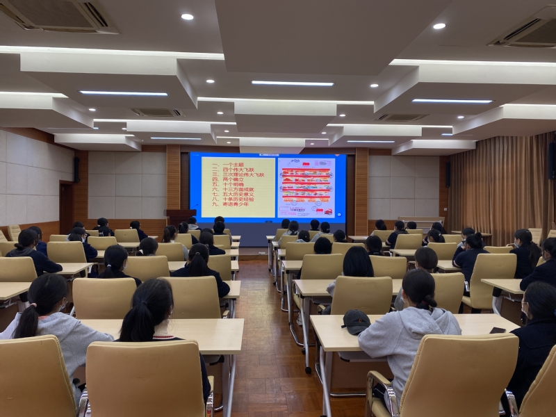 12月17日,邮票党课第三讲——“学好《决议》明使命 强国有我勇担当”在上海市辽阳中学开讲,原安徽省人大常委会委员、省人大教科文卫工作委员会副主任委员张荣国作为主讲人,围绕中共十九届六中全会《中共中央关于党的百年奋斗重大成就和历史经验的决议》(以下简称“《决议》”)内容展开,结合邮票邮品上的历史故事,和同学们深入讲述党的百年奋斗重大成就和历史经验。本次邮票党课通过沪江网“互加计划”平台同步向西部对口支援地区学校直播,下午14时整,我校46名民族班学生集中在报告厅二楼通过终端设备收听收看党课。