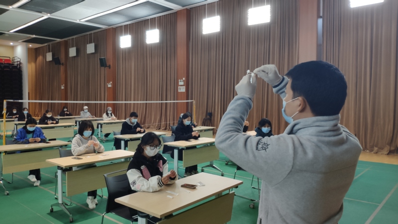 自检开始前,师生员工观看视频初步了解检测试剂盒使用方法。随后有蔡旭、许敏现场演示采集棒、抗原提取管的使用、将提取液滴入检测试剂盒内的过程,等待15分钟后出结果。