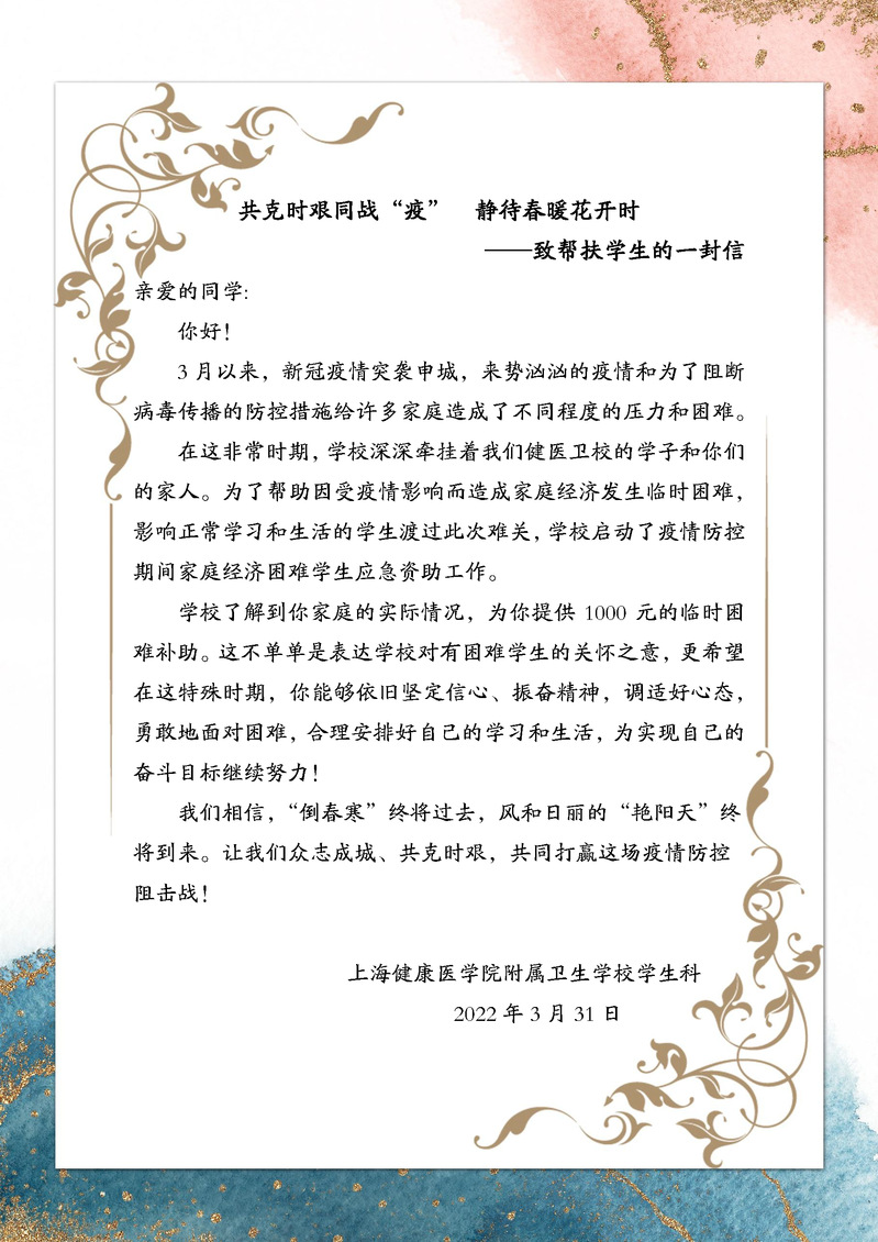 共克时艰同战“疫” 静待春暖花开时——致帮扶学生的一封信