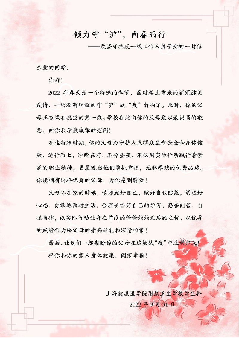 倾力守“沪”,向春而行——致坚守抗疫一线工作人员子女的一封信